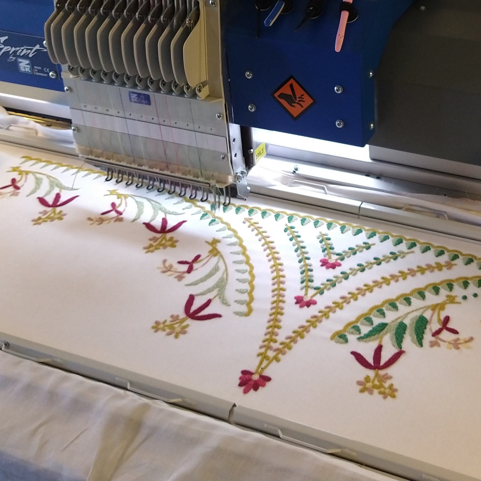 We have the Beast, a big, beautiful industrial embroidery machine with a massive 47x11 inch field. There's been a learning curve and it's still 'in progress' but we are actively working to make gorgeous textiles that you can cut and sew for your own projects.